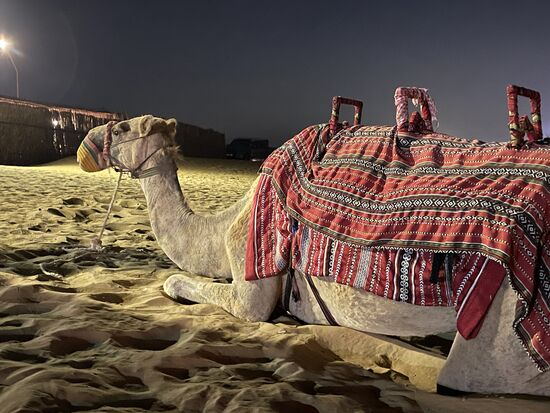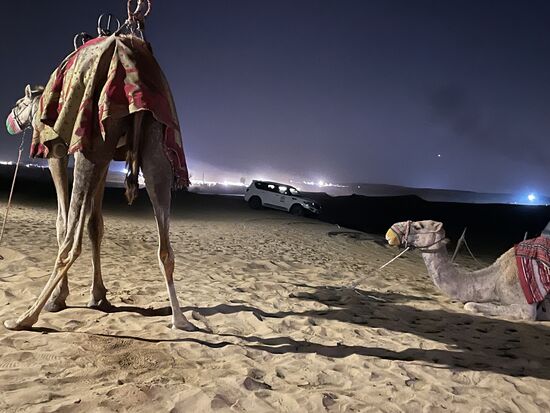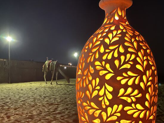 Ich schleiche derweil hinaus aus dem Camp, finde dort die beiden Kamele, die als Dekoration ruhig liegen. Vorher hatten sie bestimmt Leute auf ihrem Rücken für eine kurze Tour getragen. Hier draussen ist es ruhig. Die schönen Lampen mit den Ornamenten schenken eine wunderbare Ruhe und in den Wagen warten die Chauffeure, bis sie mit uns zurückfahren können.