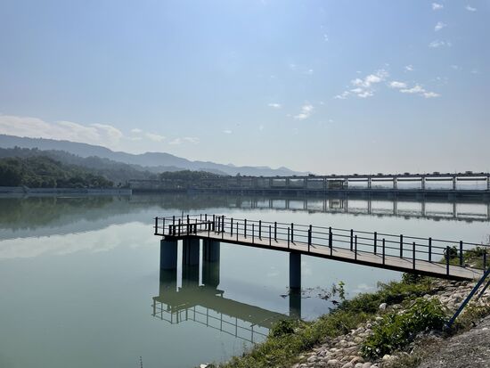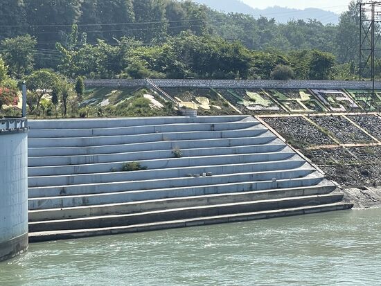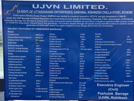 Auf der anderen Seite der Brücke gibt es einen Checkpoint. Hier müssen alle Fahrzeuge einen Wegzoll bezahlen für die Weiterfahrt. Ich nehme an, dass das ganz genau auf der Tafel aufgeführt ist, die beim Kontrollhäuschen aufgestellt ist. Ich fotografiere sie, weil sie so schön aussieht mit der weissen Schrift auf dem grün-roten Untergrund. Und weil die Frau, die davor sitzt, so freundlich lächelt. Ich soll mich zu ihr setzen, meint sie. Zusammen mit ihrem Kollegen, der im Moment Dienst hat, versuchen wir ein Gespräch, das natürlich wieder vor allem daraus besteht, woher ich komme, was ich hier tue, wie lange ich schon hier sei und wieviele Kinder ich habe. Der ganz normale Smalltalk eben. Und ich will wissen, wo das Kraftwerk ist, wo der Strom produziert wird. Das Wasser fliesst durch einen Kanal auf der Seite der Staumauer und wird dort zu einem Kraftwerk geleitet, das 14 km weiter flussabwärts liegt. Dort wird das Wasser dann wieder in den Ganges zurück geleitet.