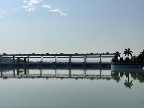 Alle interessanten Fakts sind auf einer grossen Informationstafel aufgeführt. Eingeweiht wurde das Wehr in 1980 nach einer siebenjährigen Bauphase. Die Brücke ist 312 m breit.