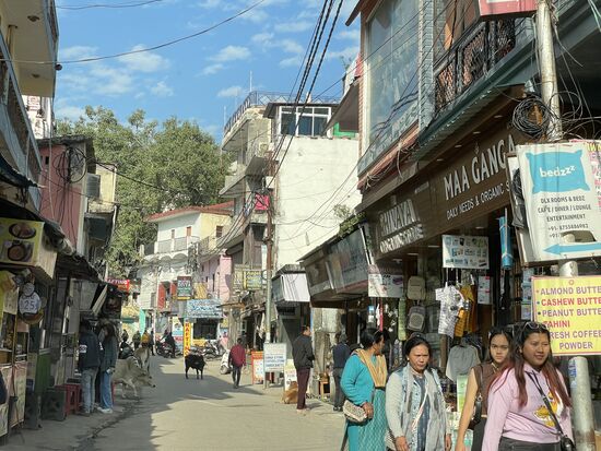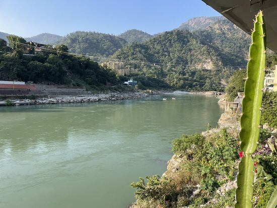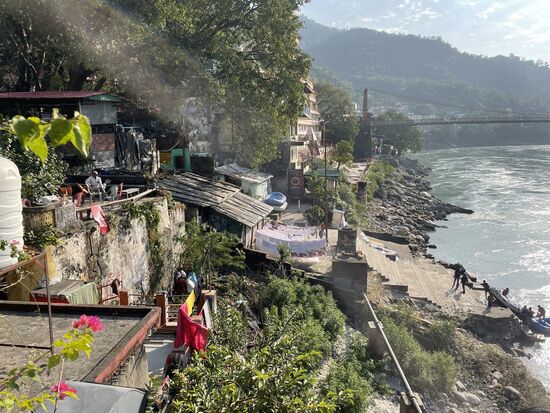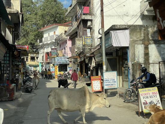 Wir gehen zurück zum Auto, fahren weiter, dem Fluss entlang und kommen zur Brücke, bei der ich gestern auf der andern Seite gestanden bin. Hier gibt es einen weiteren Teil der Stadt mit sehr vielen Ashrams und Yogaschulen. Die schmale Hauptstrasse führt durch ein Dorf. Immer wieder müssen wir ausweichen, immer wieder kommen uns Autos entgegen. Dann bleibt man einen Moment stehen, passt auf, dass die Räder nicht in den schmalen Wasserkanal fallen, der hier an vielen Stellen vor den Häusern verläuft. Man holt die Spiegel ein, passt auf, dass man ohne Kratzer aneinander vorbei kommt. Dass bei diesen Manövern Radfahrer oder Motorräder und natürlich Fussgänger trotzdem weiter gehen und ihren Platz beanspruchen ist normal. Irgendwie geht es immer weiter. Zurück setzen gilt nicht, und wenn, dann nur um Zentimeter.