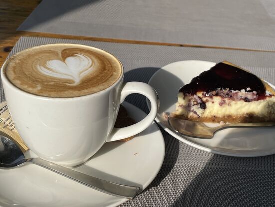 Ich aber bestelle einen Cappuccino und einen Blaubeer-Käsekuchen und geniesse die Aussicht über den Fluss, sehe einem Schlauchboot zu, das unter uns an Land kommt.
