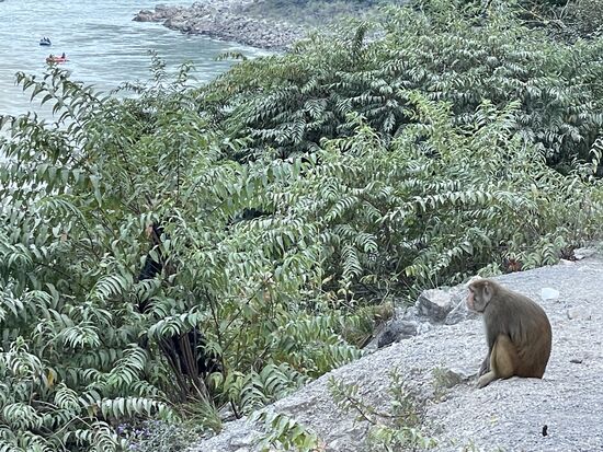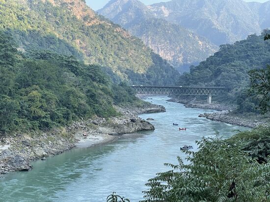 Arjun hat in der Nähe gewartet, als ich aus dem Cafe komme, ist er mit dem Auto gleich wieder bereit und wir fahren noch ein Stück weiter bis wir zu einem Ausstellplatz kommen, wo man eine tolle Übersicht hat in die Berge und hinunter zum Fluss, der sich in Windungen durch das Tal schlängelt. Unten sieht man die Schlauchboote, die gemöchlich auf dem Wasser treiben, bis es zwischen den grossen Steinen etwas wilder wird.