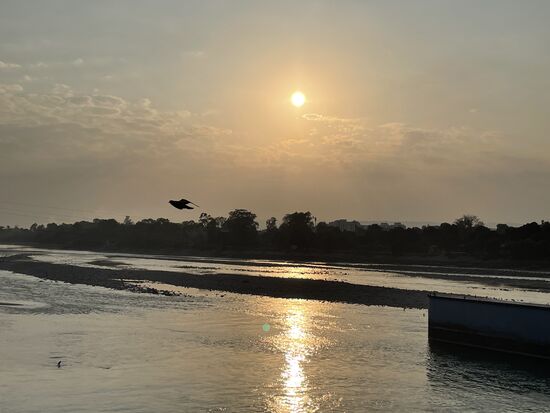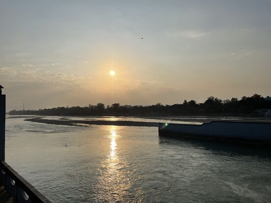 Ich studiere die Karte im Google Earth und entdecke zwei Kilometer flussabwärts eine grosse Brücke und dahinter der Fluss, der in in vielen kleinen Armen über die ganze Talbreite verteilt weiterfliesst. Das muss eine Staumauer sein, anders ist das gar nicht zu erklären. Und ausserdem fällt mir auch erst jetzt auf, dass das Wasser, das da vor mir liegt, eigentlich gar kein Fluss ist, sondern ein richtiger, breiter See. So still wie es daliegt, keine Strömung. Nur ein paar schnatternde Enten auf dem ruhigen Wasser. Hätte mir auch früher auffallen können. Aber das ist eben der Ganges, der zweitgrösste Fluss Indiens, was weiss ich schon, wie viel Wasser der mit sich bringt.
