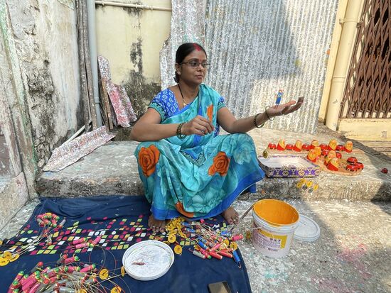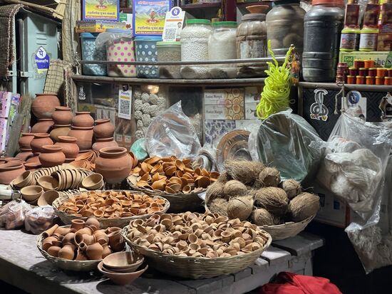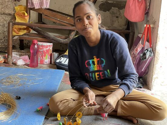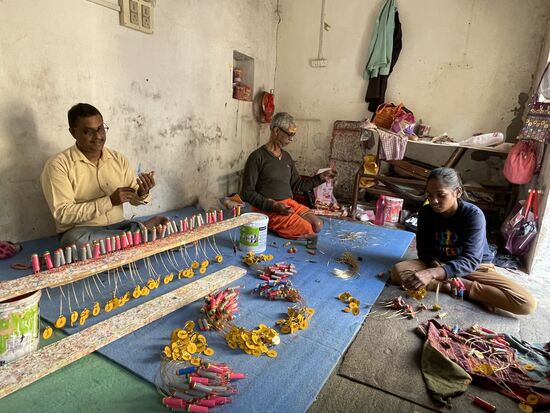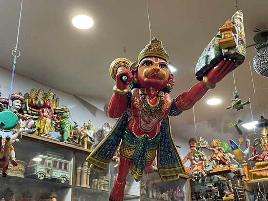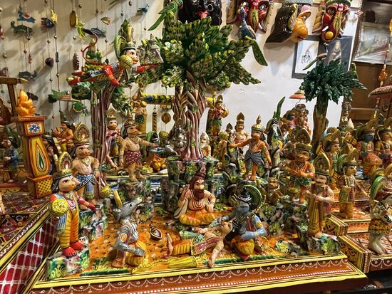 Shubhi heisst die junge Frau, die mir alles zeigt. Ihrem Vater gehört der Betrieb, sie ist bereits die 5. Generation. Ein richtiger Familienbetrieb. Stolz erzählt sie, dass sie auch exportiert. Diese kleinen Figuren mit der langen Balancierstange, die überall aufstellt werden können, gehen zum Beispiel nach Finnland. Anderes wird in Dubai verkauft. Allerdings hat der Export seit Covid stark nachgelassen, man ist im Moment erst wieder im Aufbau.