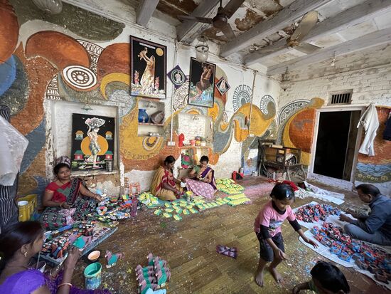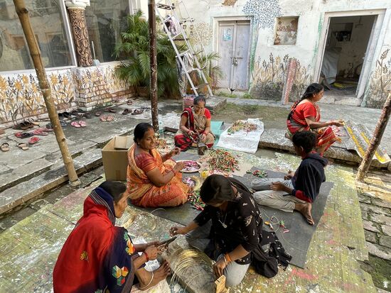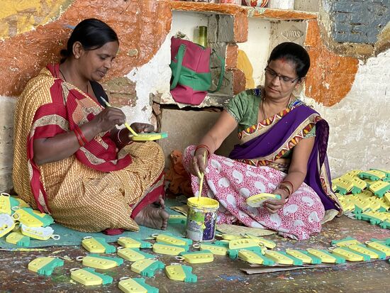 Ganz in der Nähe gibt es eine Spielzeugproduktion. Sadhov führt mich in den Garten, der wie eine eigene Welt erscheint. Ein paar niedrige Häuser, eine behelfsmässige Werkstatt unter einer aufgespannten Blache und ein farbenprächtiger Raum in einem der Häuser. Hier arbeiten Frauen, bemalen Holzspielsachen. Die Chefin, eine junge Frau, lehrt grad ein paar Frauen an, wie sie die Farben auftragen müssen. Es sind ganz kleine Schritte, einzelnde Farben, genau vorgegebene Striche und Muster. Und es entstehen witzige Kleinigkeiten. Flaschenöffner in Elefantenform, Magnete, Holzfiguren. Es ist eine Massenproduktion im kleinen. Die Holzteile werden an einem anderen Ort angefertigt, werden in grosser Anzahl angeliefert und bekommen hier die Farbe und den Finish.