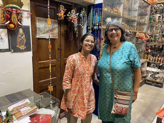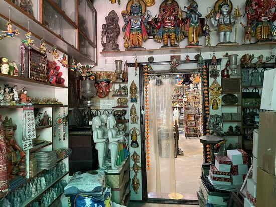 Im Laden zeigt mir Shubhi ihre Kollektion. Da gibt es Masken, Elefanten, Tiger und Vögel. Der Shop quillt über von fantasievollen Figuren in allen Farben. Der Himmel hängt voller Gottheiten und Dämonen und es gibt kleine Altare mit vielen Hindu-Figuren, die mich in ihrer Aufstellung an aufwändige Krippenlandschaften erinnern. Es gibt einfache Spielsachen und Schmuck, Holzperlen, Alles aus der eigenen Produktion und aus Holz. Die Sachen werden zum Teil hier im Laden direkt verkauft, vielfach aber auch in ganz Indien verschickt an kleine Boutiquen.