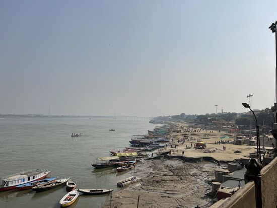 Es sind Überbleibsel vom Hochwasser, noch im Juli war der Wasserspiegel fast bis da hinauf wo wir jetzt stehen. Ja, das ist völlig normal, erzählt er, das Wasser steht immer so hoch im Sommer, der Ganges ist dann extrem breit, die Sandbänke am anderen Ufer verschwinden. Manchmal wird auch die Stadt selber geflutet, doch das kommt nur alle paar Jahre vor.