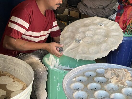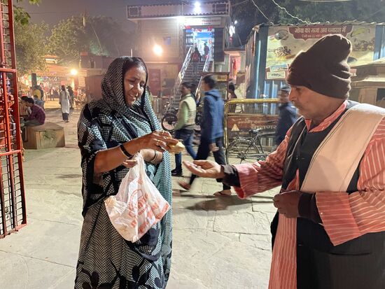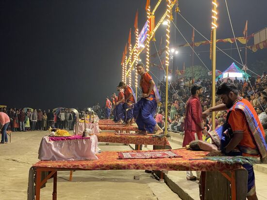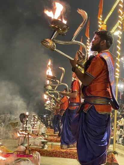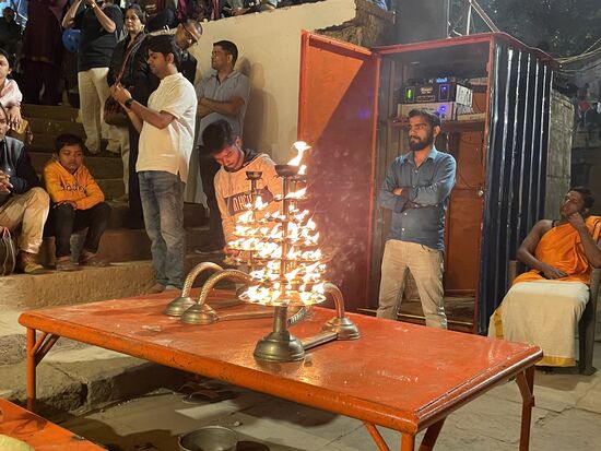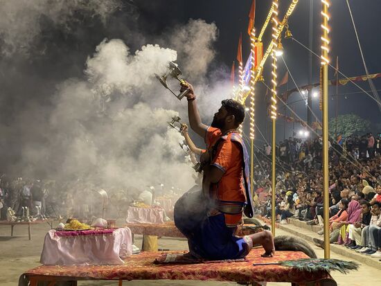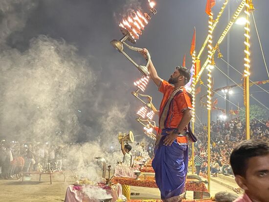 Er geht am Morgen zuerst hinunter zum Fluss, wo er sich wäscht, eintaucht in den heiligen Fluss, den Tag mit Gebeten beginnt. Essen gibt es auf der Strasse, überall stehen die Garküchen. Und am Abend geht er zur Zeremonie. Jeden Tag. Das ganze Jahr.