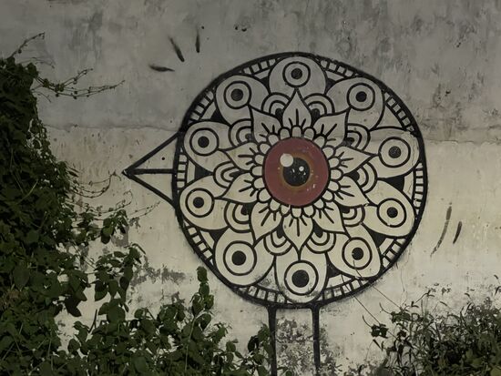 Nach Sonnenuntergang mache ich mich auf den Weg zum Ganges. Suche den Weg, den wir heute gegangen sind und verlaufe mich natürlich prompt. Stehe plötzlich vor diesem Graffiti, wo es nicht mehr weiter geht. Also zurück und um eine andere Ecke gehen. Am Schluss bin ich am Fluss, zwar nicht da, wo wir heute schon einmal standen, aber es macht nichts. Auch hier gibt es eine steile lange Treppe, die hinunter führt.