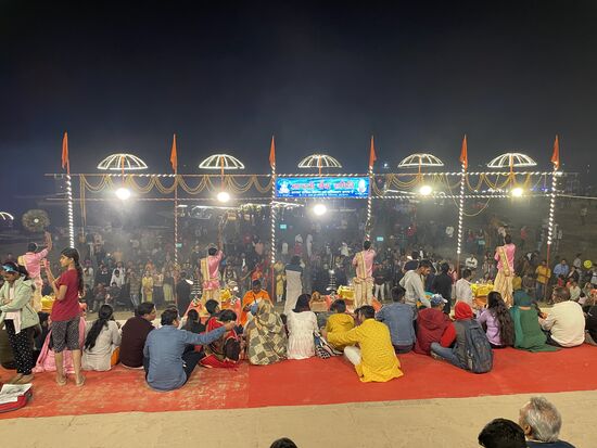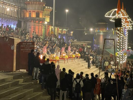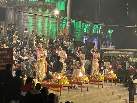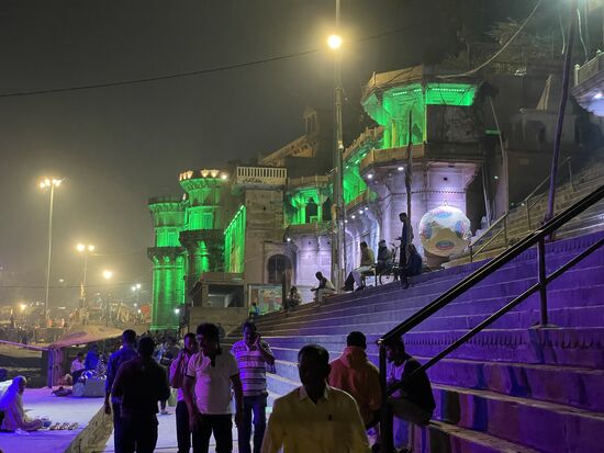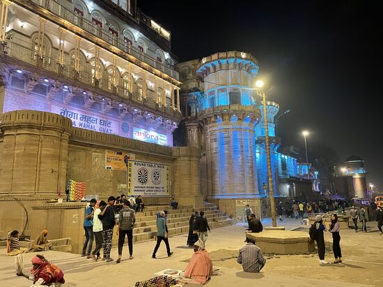 Unten am Fluss sind auch jetzt ein paar Leute, die ihre Reinigungsrituale durchführen. Ich laufe am Ufer entlang. Komme immer wieder zu neuen Treppen, die hinauf führen. Hinauf zu den Häusern, riesigen Gemäuern, die jetzt am Abend in allen Farben angestrahlt werden. Sie sehen aus wie alte Paläste oder Festungen. Ob es da Restauants gibt? Mit Sicht auf den Fluss? Hotels mit Zimmern mit Ganges-Sicht? Erkennen kann ich nichts. Nur die dicken Mauern, die runden Türme, die Zinnen. Werde morgen danach fragen. Jedenfalls ist es einfach. am Ufer entlang zu laufen. Irgendwann komme ich auch zu den beiden Orten wo die Zeremonie stattfinden wird. Es sind viele Menschen unterwegs und je näher ich dem Zeremonienplatz komme, um so mehr sind es.
