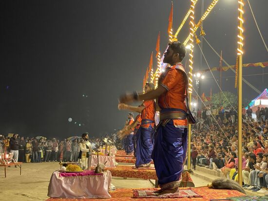 Als die erste Zeremonie sich dem Ende nähert, die Zuschauer anfangen, die Flammen zu schwenken, erste Blumenschiffchen auf den Ganges geschickt werden, drehe ich mich um, mache ein paar Schritte und sehe der zweiten Zeremonie zu. Auch hier ist die Tribüne voll. Irgendwo wird wohl Shado dabei sein. Mit seinen Gebeten und seinen Gesängen.