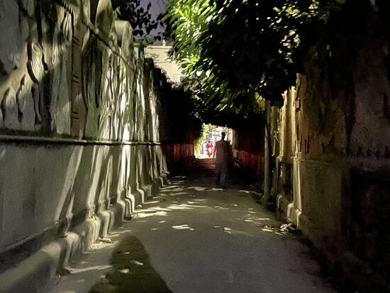 So habe ich an den ersten beiden Tagen die Stadt also nur nachts kennengelernt. Den Weg zur Pizzeria hat mir am ersten Abend der Angestellte vom Hotel gezeigt. Und ich bin ihn dann später allein zurück gegangen und habe erstaunt festgestellt, dass ich keinen Moment unsicher war. Auch wenn der Weg durch die dunkle schmale Gasse führte, auf der man aufpassen muss, wo man hintritt, denn natürlich gehen den Weg auch die heiligen Kühe und Hunde und nicht immer wird alles sofort wieder geputzt. Obwohl, in Anbetracht der vielen Tiere, die unterwegs sind, sind die Strassen relativ sauber. Irgend jemand muss da immer am reinigen sein.