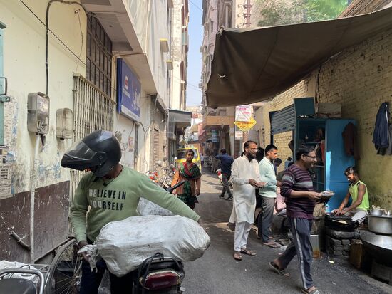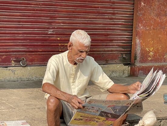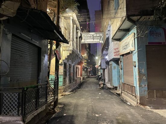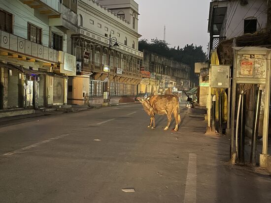 Vor Sonnenaufgang ist es in den Strassen von Varanasi noch ruhig. Nur eine Kuh ist bereits auf den Beinen und später kommt mir ein Mann entgegen, der mir eine Bootsfahrt auf dem Ganges verkaufen will.
