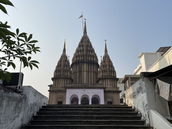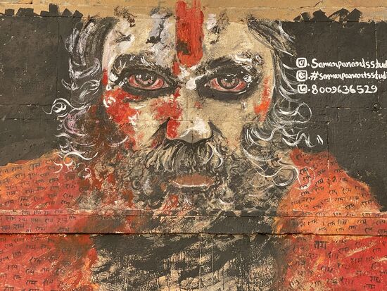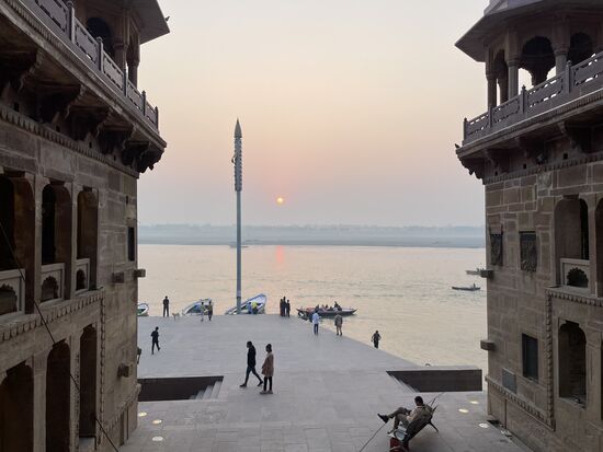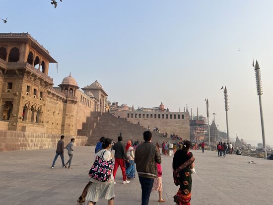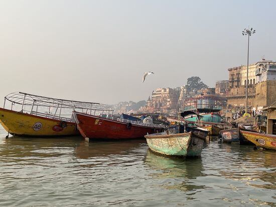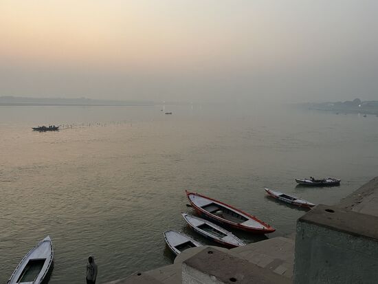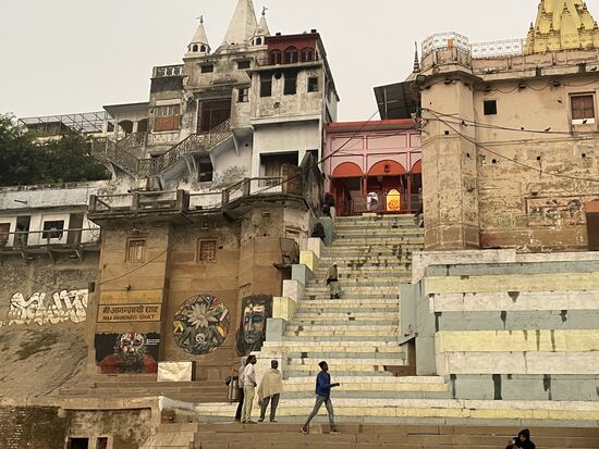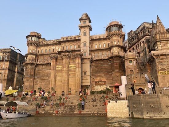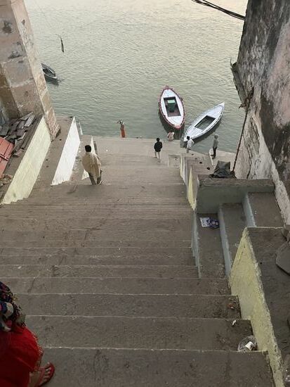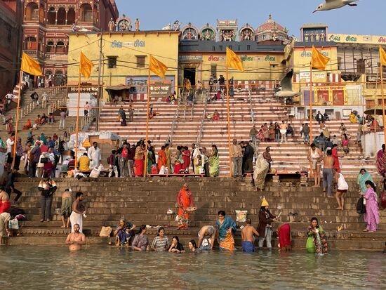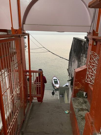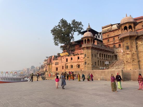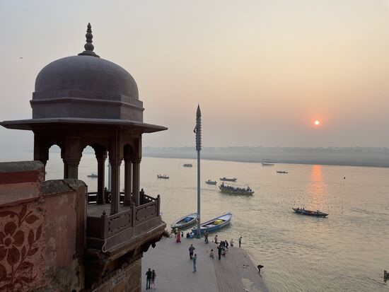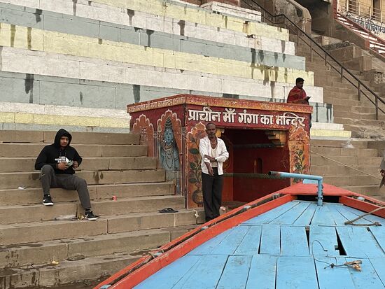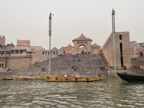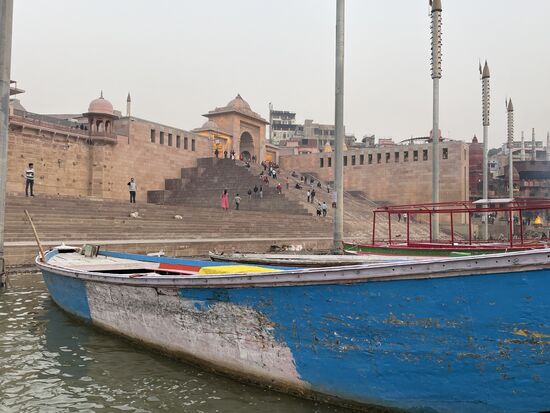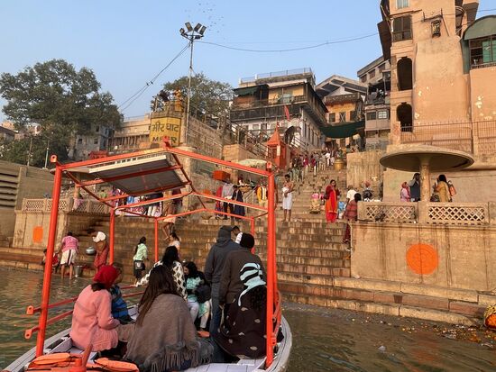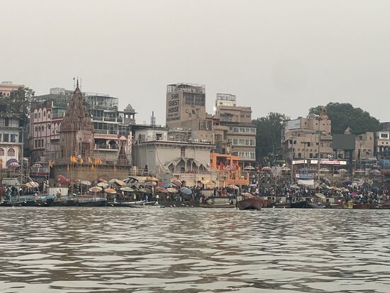 Wir fahren bis zur grossen breiten Treppe, wo oben die drei markanten Tore den Eingang zum Tempelbereich des goldenen Tempels markieren. Eine dicke moderne Mauer trennt das nächste Ghat von den Blicken ab. Es ist das Burning Ghat, ein ganz besonders heiliger Ort. Hier werden die Toten der Stadt öffentlich kremiert. Auch jetzt kann man ein grosses Feuer sehen und Rauch, der über dem Platz aufsteigt. Wir drehen um, fahren zurück zur breiten Treppe. Nebst uns sind noch ganz viele Boote unterwegs. Mit Touristen, vor allem indischen, die Varanasi besuchen.