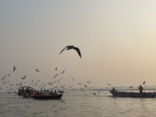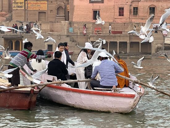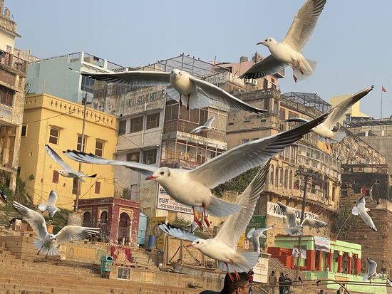 Viele Boote werden von Vögeln begleitet, ob das Fischerboote sind? Nein, meint Dipa, die Leute füttern die Vögel. Denn die können nicht arbeiten, darum muss man sie unterstützen. Genauso wie die Hunde und die Kühe. Man achtet auf sie, lässt niemanden verhungern. Überall gibt es Futterstellen für Hunde, für Vögel, wo roher und gekochter Reis ausgestreut wird. Einen kurzen Moment überlege ich, dass hier wohl sogar die Hunde Vegetarier sind, denn Fleisch wird hier in Indien nirgends viel gegessen.