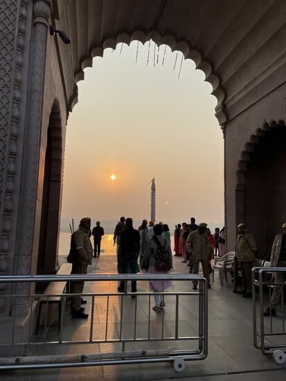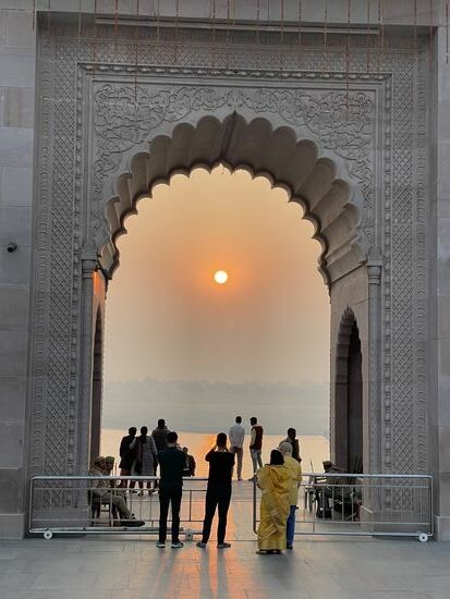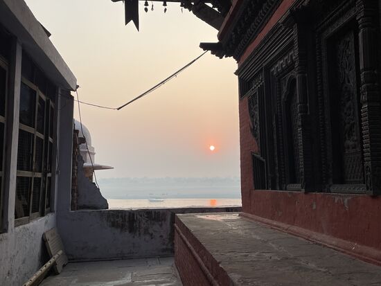 Wir gehen weiter, sind jetzt auf der Höhe über dem Ghat und jetzt kann man auch die Sonne sehen, die schon ziemlich hoch steht und langsam in eine orang-goldene Farbe wechelt.