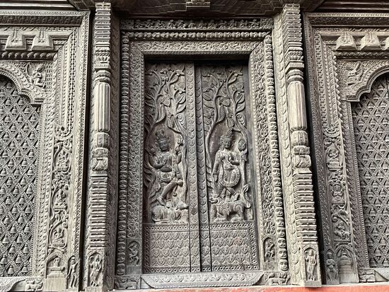 Wir verlassen das Boot, steigen die Treppe hinauf, kommen links von den grossen Toren zum Nepalesischen Tempel. Ob ich ihn sehen will? Selbstverständlich. Es ist ein offener Bereich mit einem kleinen Gebäude in der Mitte. Wir umlaufen es einmal, die geschlossenen Fenster sind mit wunderbar aufwändigen Holz-Schnitzereien verziert. Ein paar Menschen verneigen sich vor dem eigentlichen Heiligtum.