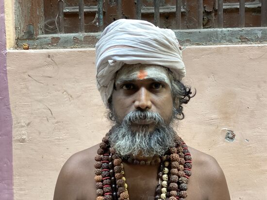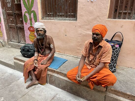 Das Gate 4 ist auf der anderen Seite der grossen Anlage. Ich glaube Dipa, will da jetzt nicht hin, denn unten wartet der Schiffsführer noch immer auf uns. Allzulange sollten wir ihn nicht warten lassen. Jedenfalls gehen wir noch durch ein paar enge Gassen, wo ich diese orange gekleideten Männer antreffe. Noch immer ist mir nicht ganz klar, welche Funktion sie haben Gelten sie als heilige Männer? sind es Babas? Oder verzichten sind sie nur für eine gewisse Zeit ihres Lebens auf allen Komfort. Ich frage, ob ich sie fotografieren darf und sie wiegen den Kopf. Alles klar.