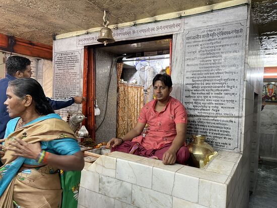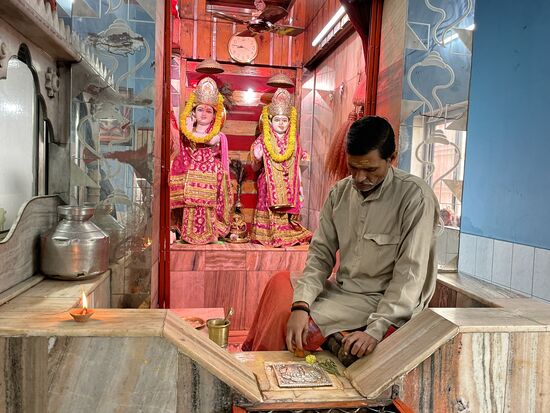Zum nächsten Tempel gehört ein grosser Wasserspeicher. Es ist der Tempel, der einer Göttin gewidmet ist. Es ist der Shri Durga Tempel, oft wird er auch einfach Affentempel genannt, weil er von vielen Affen bevölkert wird. Wir ziehen beim Eingang unsere Schuhe aus und treten zuerst in verschiedene kleine Räume. In einem sitzt ein Priester und er streicht allen Besuchern, die zu ihm kommen eine helle Paste auf die Stirn. Eigentlich wollte ich das nicht, lasse es aber zu, weil mich Dipa dahin geschickt hat.