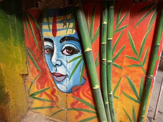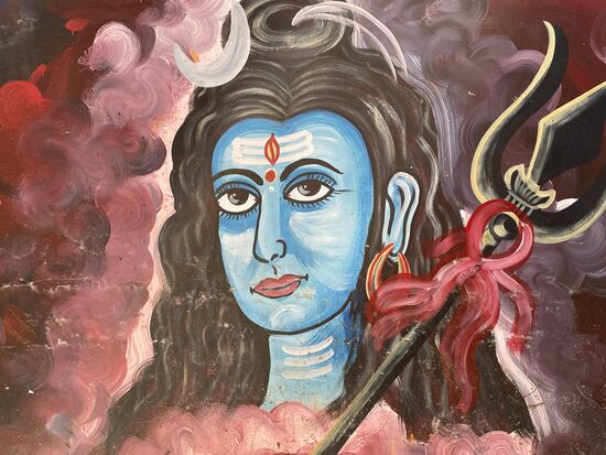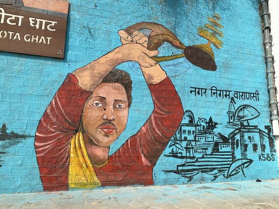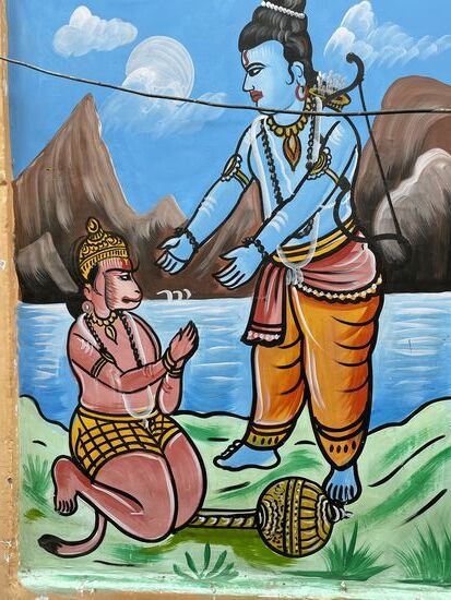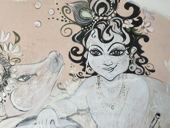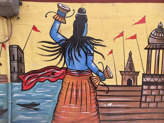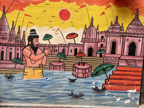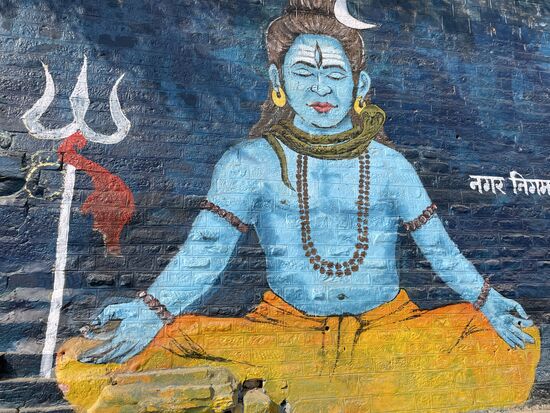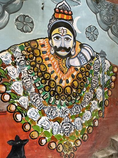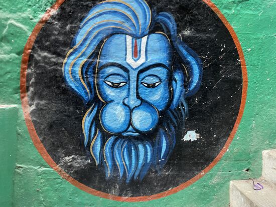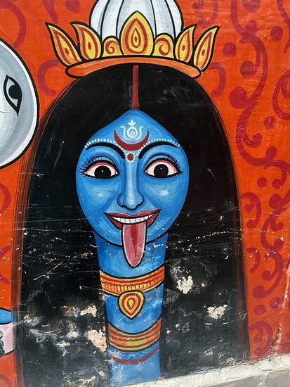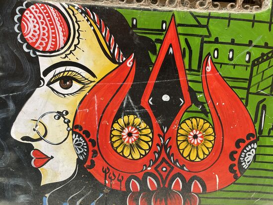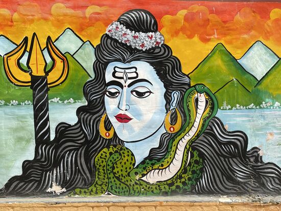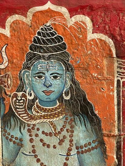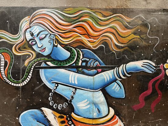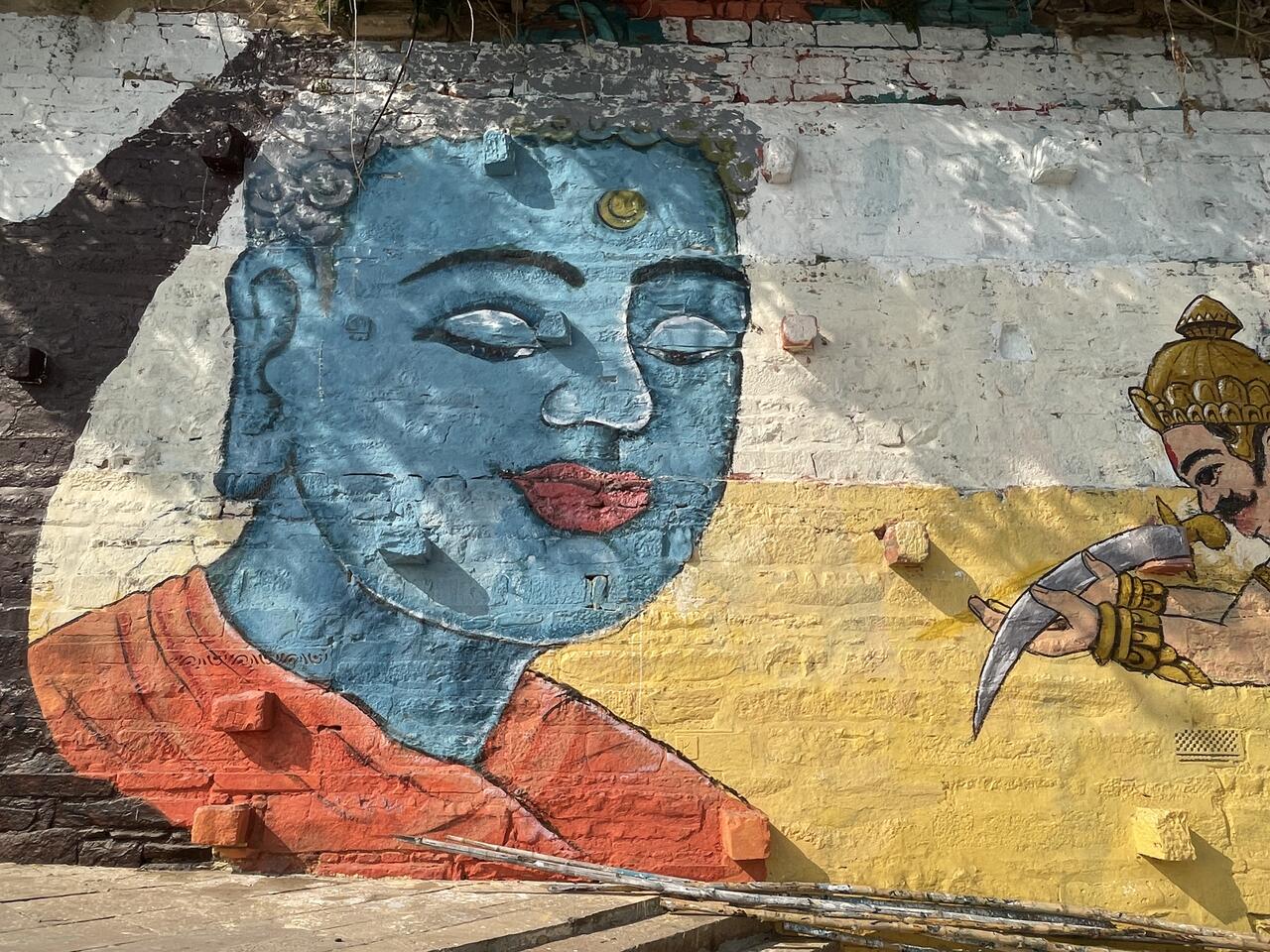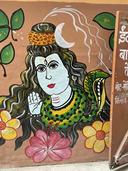 Ich habe in Varanasi so auffällig viele Graffitis an den Wänden gefunden, dass ich ihnen ein eigenes Kapitel widmen möchte. Die Themen sind vielfältig, mit vielen Blumen und Ornamenten, kommen aber auch sehr oft aus der gesamten Götterwelt Viele sind riesig, mehrere Meter hoch, andere kleben zwischen zwei Fenstern, neben Türen. Es gibt alte verwitterte aber auch sehr viele ganz neue leuchtend farbige Bilder.