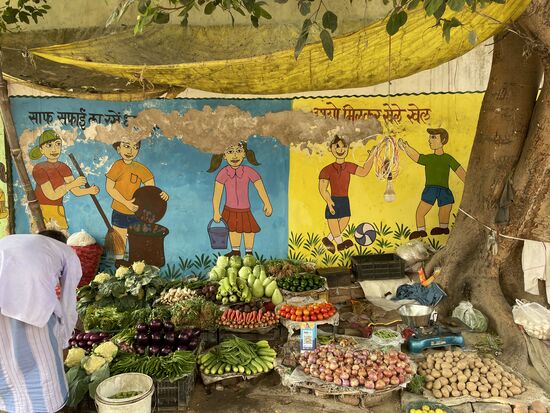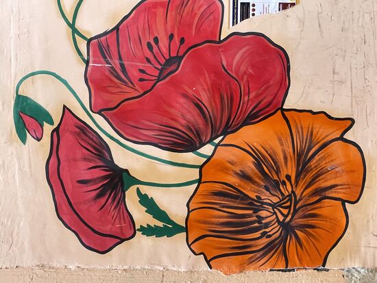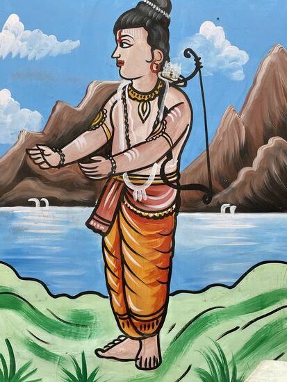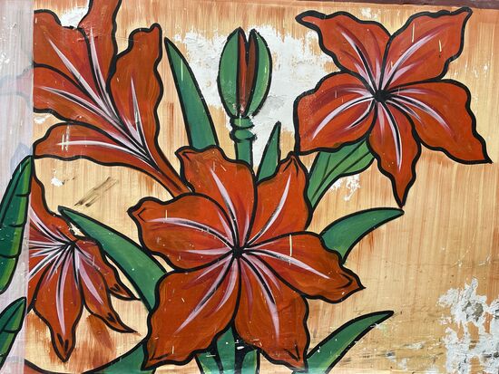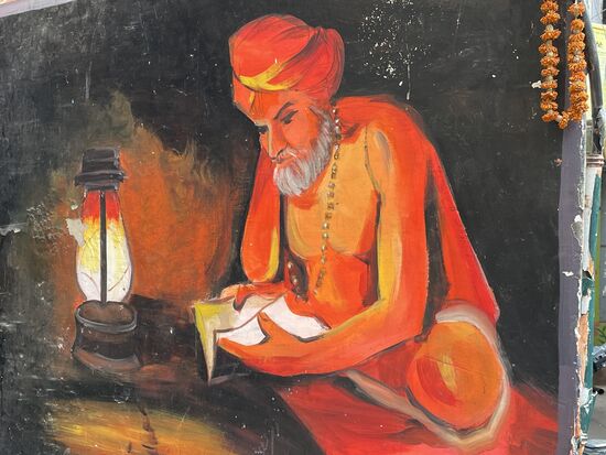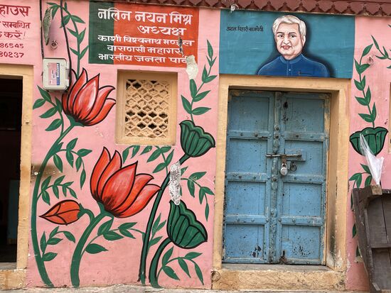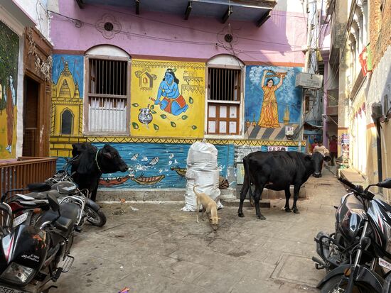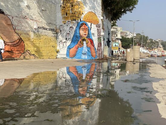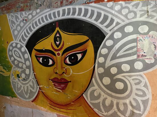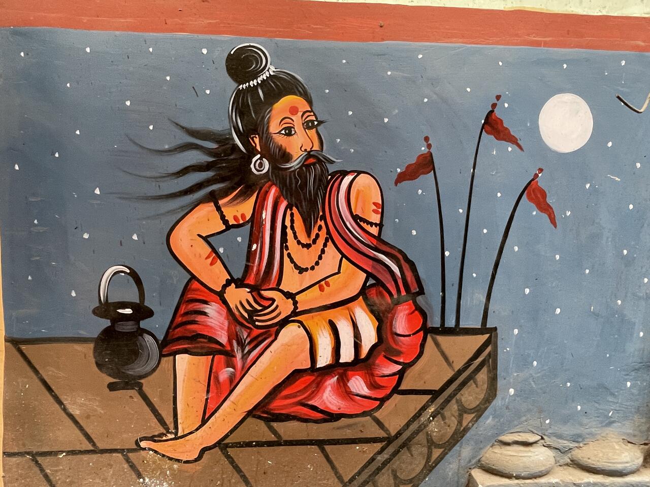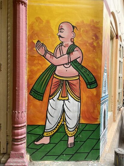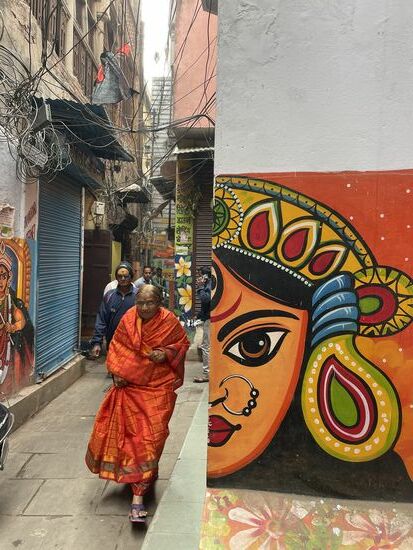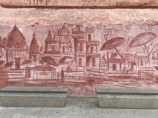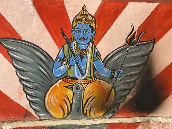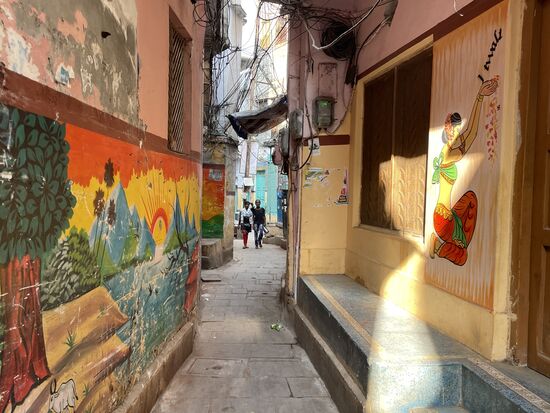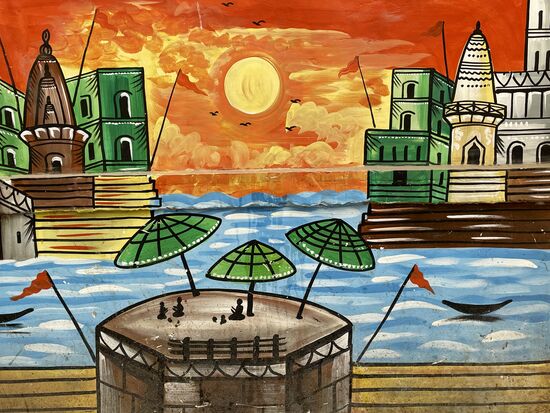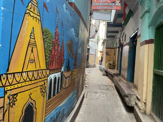 Ich habe in Varanasi so auffällig viele Graffitis an den Wänden gefunden, dass ich ihnen ein eigenes Kapitel widmen möchte. Die Themen sind vielfältig, mit vielen Blumen und Ornamenten, kommen aber auch sehr oft aus der gesamten Götterwelt Viele sind riesig, mehrere Meter hoch, andere kleben zwischen zwei Fenstern, neben Türen. Es gibt alte verwitterte aber auch sehr viele ganz neue leuchtend farbige Bilder.
