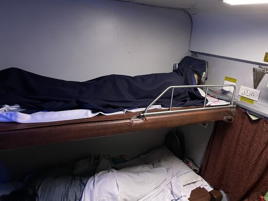 Es klappt alles. Der Zug fährt um 5.15 Uhr auf der anderen Plattform ein, mein Wagen ist ganz vorn, also muss ich sehen, dass ich ihn vor der Abfahrt erreiche und dann bin ich drin. Ein Schaffner sieht, dass ich mich mit dem Koffer und der Platznummerierung etwas schwertue. Er packt meinen Koffer und öffnet die Wagentüre zu den Sitzen. Doch da sind gar keine Sitze. Es ist ein Ersteklasse-Liegewagen, wie ich sie bereits von anderen Fahrten kenne. Mein Abteil ist abgeschlossen, auf wiederholtes Klopfen wird es von innen geöffnet. Die Pritsche oben rechts ist noch frei in den anderen drei liegen Menschen. Schlafend. Also klettere ich hinauf, versuche, es mir bequem zu machen. Bekomme vom Schaffner ein in Papier eingepacktes Leintuch, mit dem ich nun, da ich bereits auf der Pritsche liege, herzlich wenig anfangen kann, ein Kissen und eine Wolldecke. Einmummeln und versuchen zu schlafen. Der Rucksack liegt zu meinen Füssen, den Koffer hat man unter die untere Pritsche geschoben, die Türe wird geschlossen, der Mann unter mir steht kurz auf, verschliesst sie, schläft weiter.