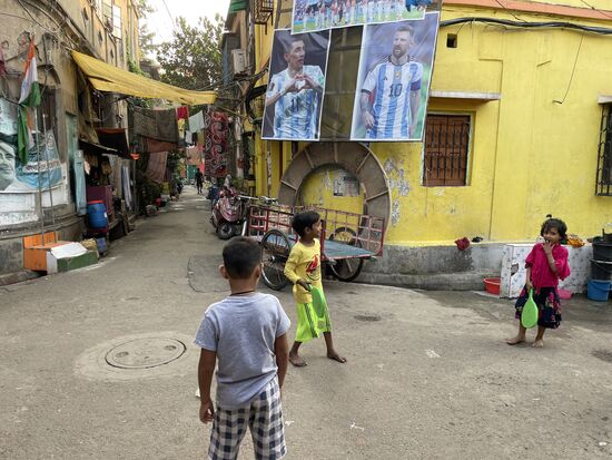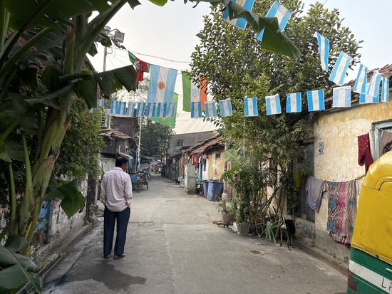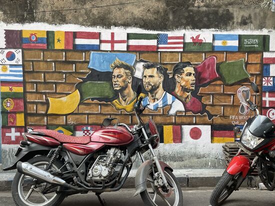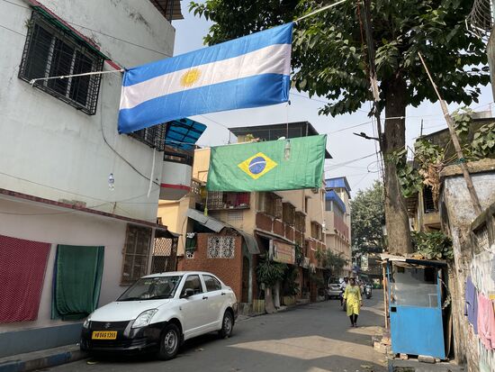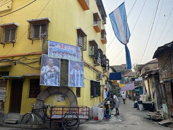 Heute aber zieht es mich wieder hinaus. Und da ich mich jetzt nicht mehr mit Taxis herumschlagen mag und auch die Suche nach einem englisch sprechenden Fahrer aufgegeben habe, mache ich mich gleich auf den Weg zur nächsten UBahn-Station. Dabei treffe ich tatsächlich auf das allererste Zeichen zur WM in Indien. Ich weiss nicht, ob sich Inder überhaupt für Fussball interessieren aber hier in Kolkata sehe ich zum ersten Mal ein paar Brasilien und Argentinien-Fahnen über der Strasse wehen. Und an der Wand prangt ein ganz neues WM-Graffiti. Es scheint hier also doch Fans zu geben.