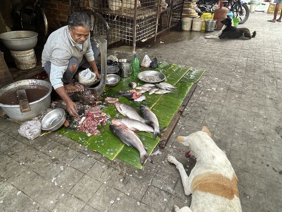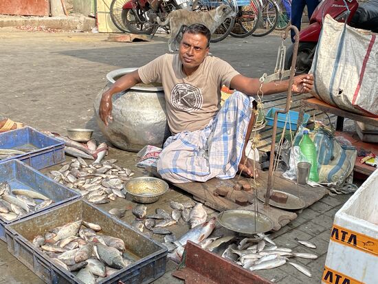 Kurz darauf bin ich mitten in einem Fischmarkt. Da werden Fische auf dem Boden ausgelegt auf grossen Bananenblättern. Sie werden ausgenommen, zerhackt, ganz oder als Teile verkauft. Ein leichter Fischgeruch liegt zwar in der Luft, aber es sind frische Fische. Aus dem Meer? das liegt ja nur 50 km entfernt. Ich versuche meine Fragen zu stellen, doch es gibt keine Antworten. Kolkata ist tatsächlich der erste Ort in Indien wo ich niemanden finde, der Englisch spricht. Das ist doch sehr überraschend. Ob man sich hier so stark von der britischen Vergangenheit abwenden will, oder ob einfach das Bildungssystem, resp. das Verständnis für die Wichtigkeit der Bildung in den ärmeren Schichten fehlt. Natürlich gibt es auch hier viele gebildete Menschen in guten Positioen, doch die Leute, mit denen ich in Kontakt komme, scheinen in der Schule schwere Defizite zu haben.