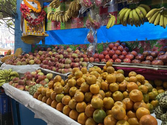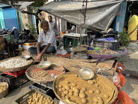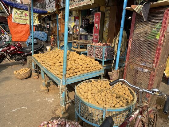 Auch ein paar Gemüse und Früchtestände gehören dazu. Vor allem Kartoffeln fallen mir auf. Je mehr nördlich in Indien, je mehr sieht man Kartoffeln. Im Süden waren sie weniger präsent. Was allerdings nie fehlen darf, sind Zwiebeln und Knoblauch. Die findet man überall.