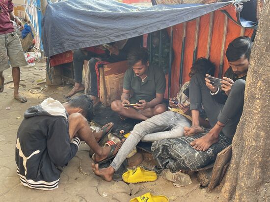 Unter einem der nächsten Verschläge hocken 4 junge Männer. Jeder spielt oder chattet mit seinem Handy. Ob sie keine Arbeit haben? Oder ob sie bereits müde sind, weil sie die halbe Nacht irgendwo gearbeitet haben. Waren geschleppt. Was weiss ich schon. Ich versuche daher, nicht zu viel zu denken, keine Vorurteile aufkommen zu lassen, einfach nur sehen, hinsehen.