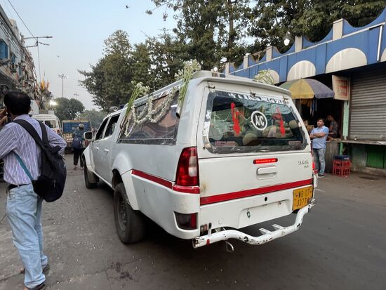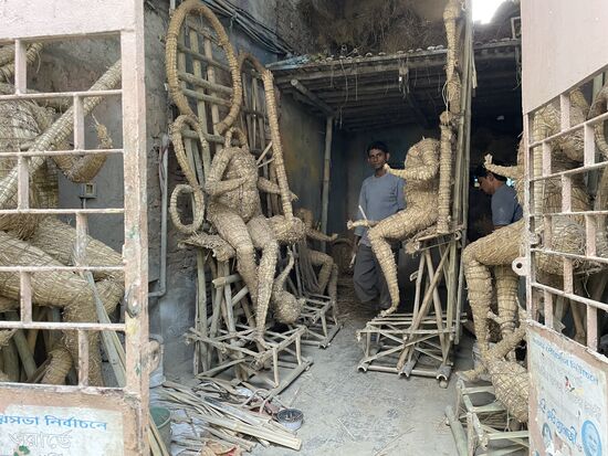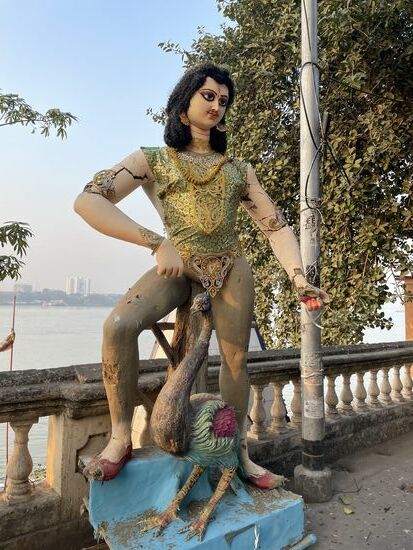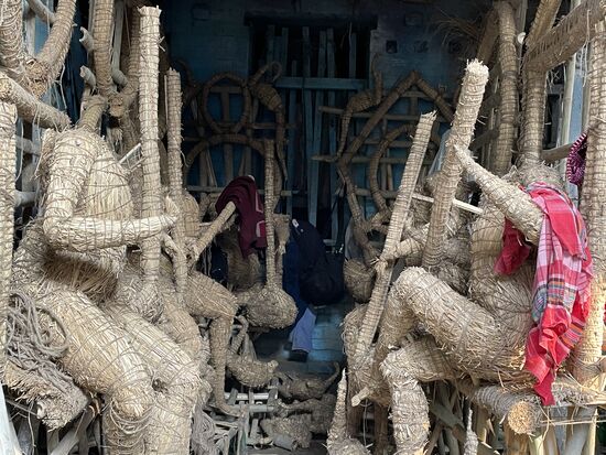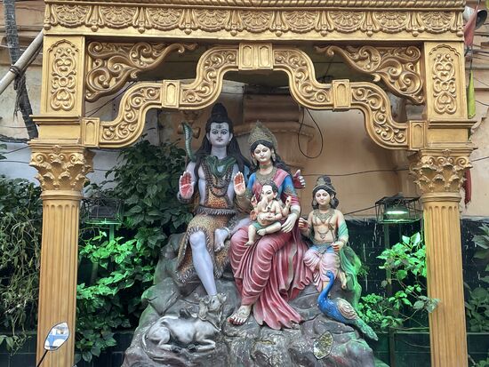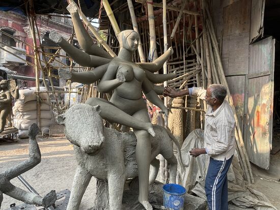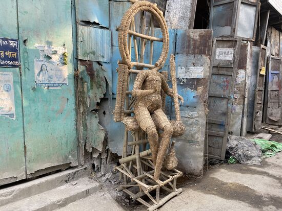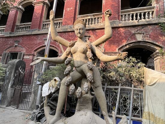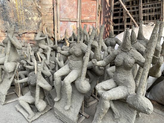Als ich dann bei einer anderen Werkstatt eine ganze Kolonie dieser Figuren mit einer Lehmschicht umschlossen sehe, dämmert es mir. Nicht kleine Tonfiguren sind es, die hier gemacht werden, sondern riesige Götterbilder. Viele Frauenfiguren mit grossen Brüsten und mehreren Armen. Es ist Kali, eine wilde schwarze Göttin.