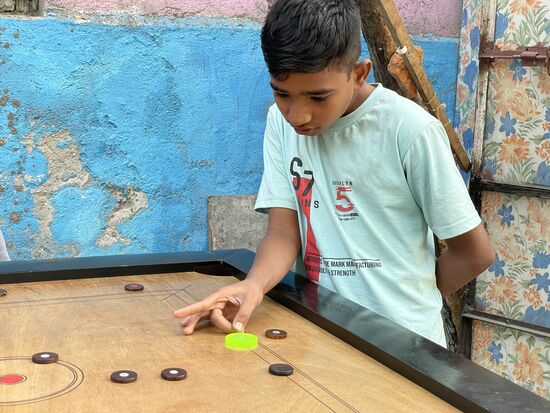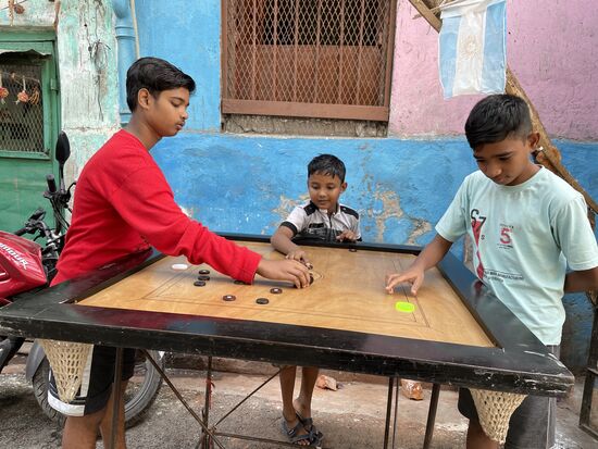 Ein paar Ecken weiter haben zwei Buben ein Carron aufgestellt. Ein Brettspiel, das in Asien sehr verbreitet ist. Es wird auch Fingerbillard oder Carambole genannt. Geschickt jagen sie ihre Scheibe über das Brett und versuchen die Spielsteine in den Löchern zu versenken. Bei ihnen wird noch nichts aufgeschrieben, aber bestimmt wissen auch sie, welcher der beiden der bessere ist. Der Kleine in der Mitte möchte vielleicht auch mitspielen, doch die beiden grossen müssen die Sache erst einmal untereinander ausmachen.
