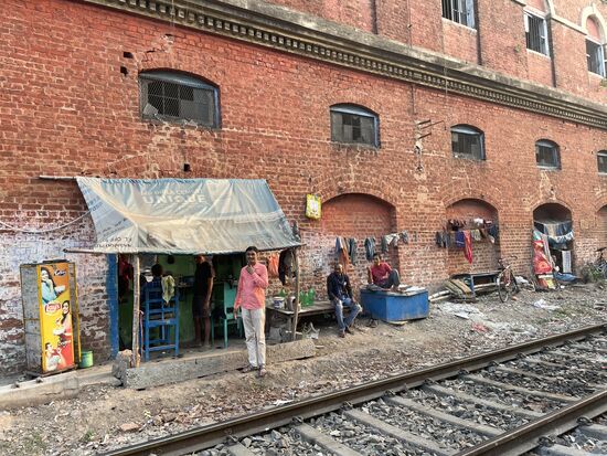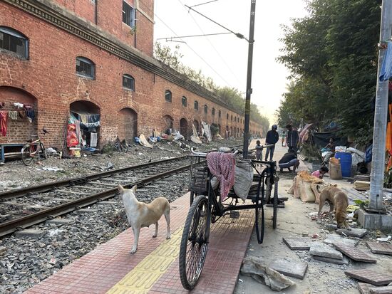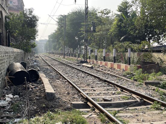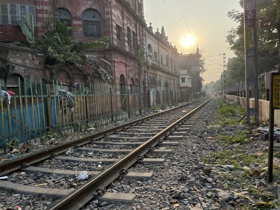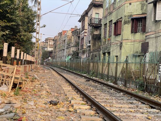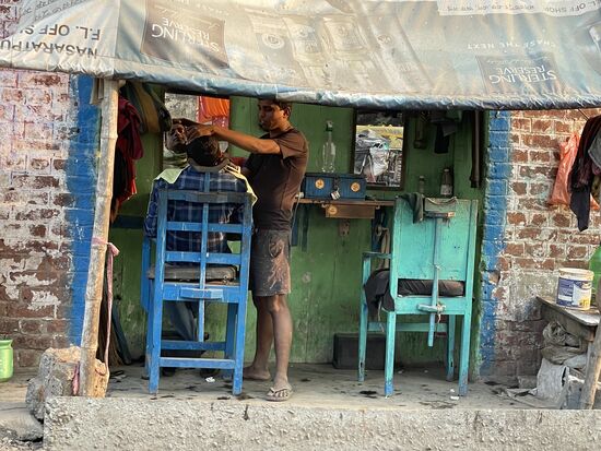Unerwartet komme ich zur Bahnlinie. Der Bahnübergang ist unbewacht und so checke ich erst einmal beide Seiten genau ob sich kein Zug nähert, bevor ich versuche, die Geleise aus verschiedenen Winkeln aufzunehmen. Das Leben spielt sich hier auf beiden Seiten der Schienen ab. Kinder spielen, Hunde suchen etwas zu fressen, der Coiffeursalon ist direkt am Bahngeleise, der Mann der grad frisiert wird, hat mich durch den Spiegel entdeckt, winkt mir zu.
