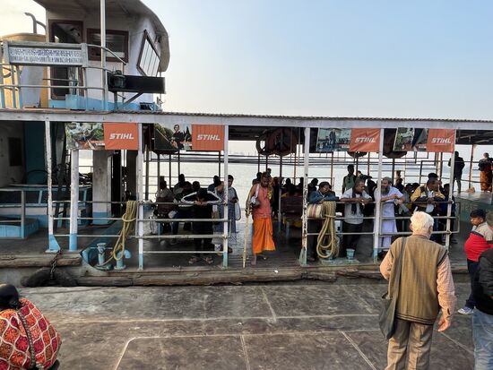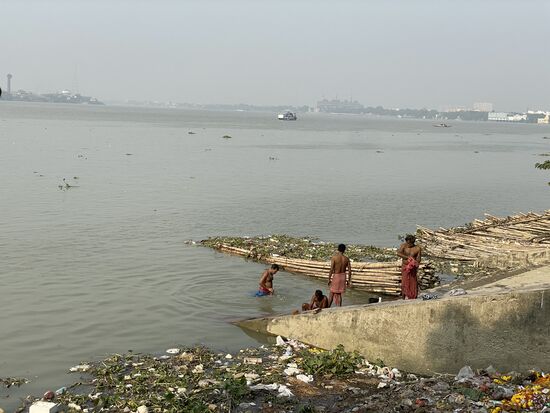 Ich schlendere dem Ufer entlang, gehe manchmal hinunter zum Fluss, fotografiere, sehe den Leuten zu, die ihre Reinigungsrituale halten, oder sich schlichtwegs waschen. Wie jener Mann, der sich bevor er ins Wasser steigt, zuerst richtig einseift Danach taucht er einmal komplett unter und ist sauber.