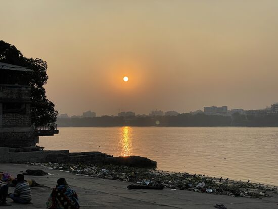 Ich bin jetzt am Fluss angekommen, der hier sehr breit ist. Eben nähert sich die Sonne im Westen langsam dem Horizont. Noch ist es erst gut vier Uhr, aber in einer Stunde wird es wohl dunkel sein. Zeit also, mich zu organisieren, damit ich bei Einsetzen der Dunkelheit irgendwo bin, wo Taxis fahren. Da wo ich seit ich aus der UBahn gewesen bin, habe ich den ganzen Nachmittag keine Taxis, ja kaum Autos gesehen.