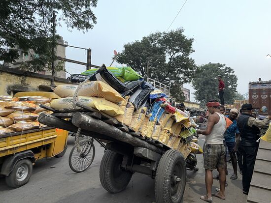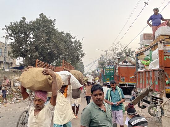 Beim Weitergehen werde ich allerdings ganz schnell wieder von der Realität abgelenkt. Ich bin jetzt in der Nähe, wo ich vorgestern schon einmal war. Da wo die Lastwagen stehen, die ausgeladen werden. Letztes Mal war ich auf der anderen Seite von Schiene und Strasse, jetzt bin ich direkt am Fluss. Lastwagen an Lastwagen stehen sie da. Hoch beladen. Und die Fracht wird umgeladen auf die Träger und ihre Wagen. Auf Köpfe und Schultern. Ein, zwei Säcke mit schwerem Inhalt. Es ist eine ganze Karawane, die mir jetzt entgegenkommt. Männer mit Lasten, Wagenladungen, Rischkas. Es hört überhaupt nicht mehr auf. Und das Gedränge nimmt zu. Jetzt muss ich aufpassen, niemandem in Wege zu sein.