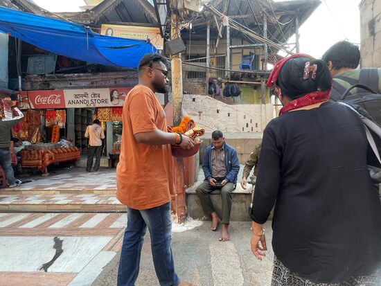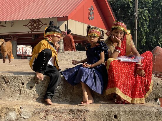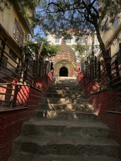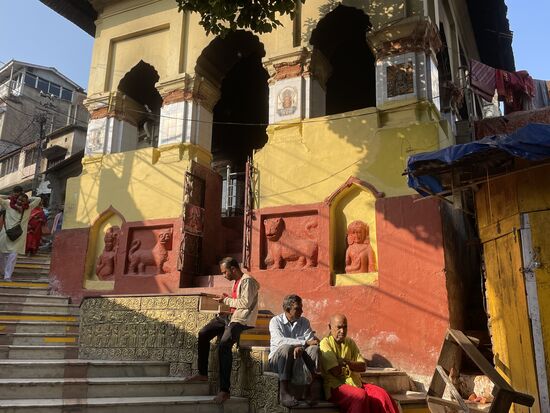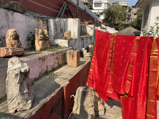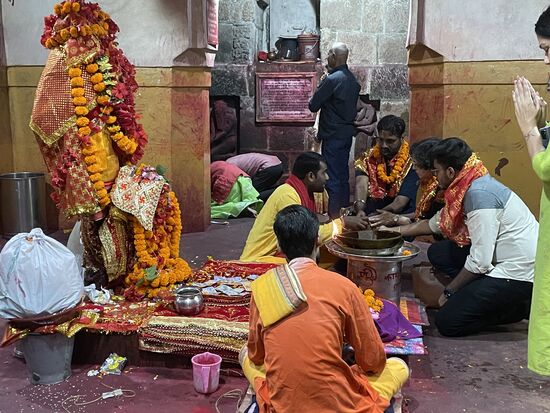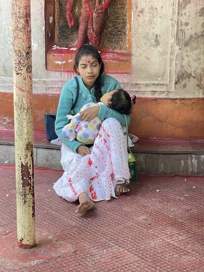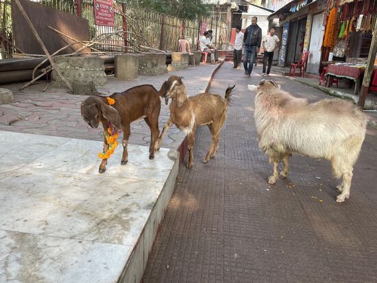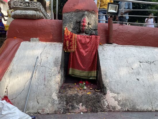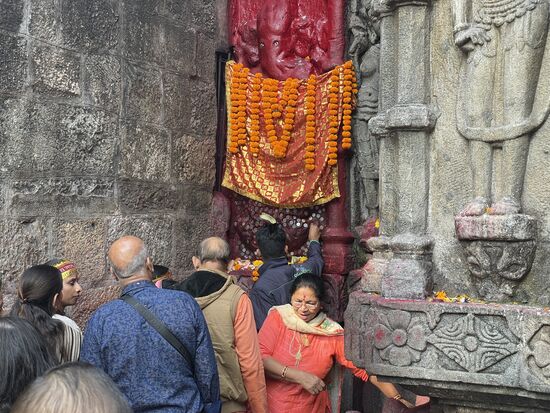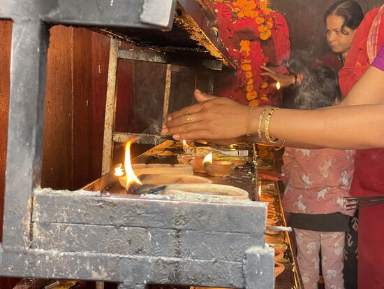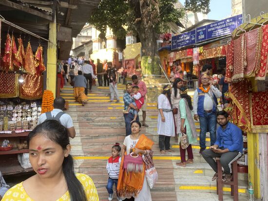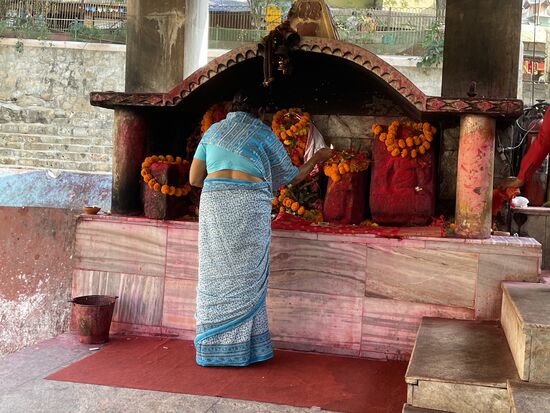 Überall sind sie, diese kleinen Altare, Gebetsnischen, Statuen, Gottheiten. Und überall leuchtet es rot vom roten Pulver, das hier allgegenwärtig ist. Sogar die weisse Ziege hat ihren Teil abbekommen und ein paar Tauben sind ebenfalls rosa gefärbt. Die Pilger kommen, berühren den Boden, berühren ihre Stirn, den Mund, fast könnte man meinen, sei würden ein Kreuzzeichen machen. Es ist ihre Ehrerbietung an den Ort und an die Göttin. Sie kommen mit Blumenschalen, bringen rote Tücher, Früchte, Wasser.
