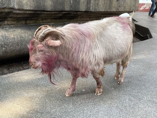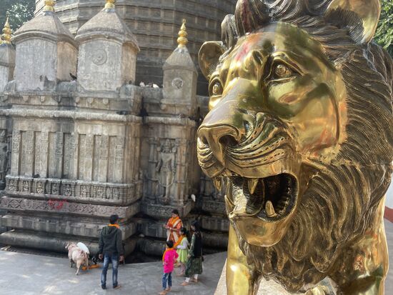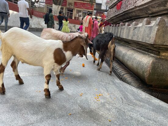 Erst dann mache ich mich auf, den Tempel zu erkunden. Zwei grosse goldene Löwen bewachen den Innenhof, aber die vielen Ziegen, die überall unterwegs sind, lassen sich dadurch nicht einschüchtern. Viel gibt es hier nicht für sie zu fressen, es wächst kein Halm zwischen den steinernen Platten, aber manchmal liegen da ein paar Blumen, die die Pilger verloren haben oder die Ziegen bedienen sich direkt bei den vielen kleinen Andachtsnischen.