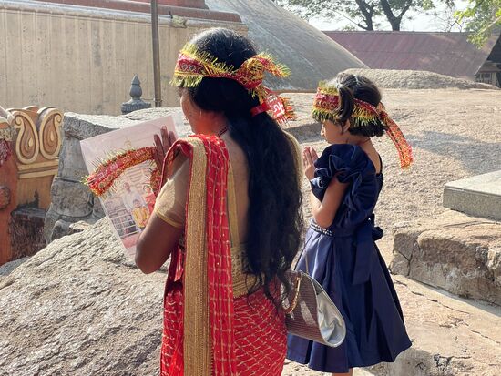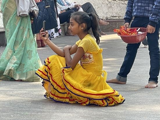Genauso wichtig wie die Verehrung ist aber auch das Posieren, das Festhalten des heutigen Besuches im Tempel. Die vier jungen Männer, die sich in betender Position ablichten lassen, frage ich, ob das ihre Haltung sei: drei beten, einer arbeitet, denn der vierte ist am Handy, wobei ich gar nicht sicher bin, ob er auch wirklich mit jemandem spricht. Es scheint tatsächlich nur ein Posieren zu sein.