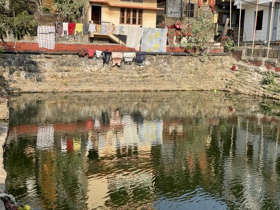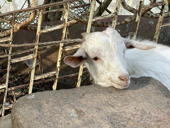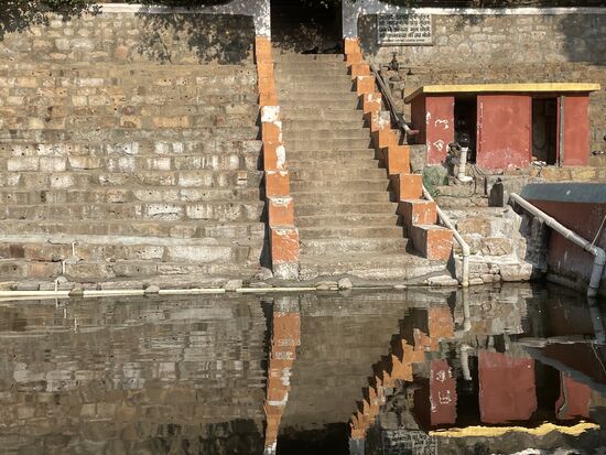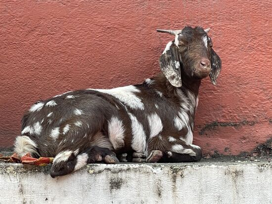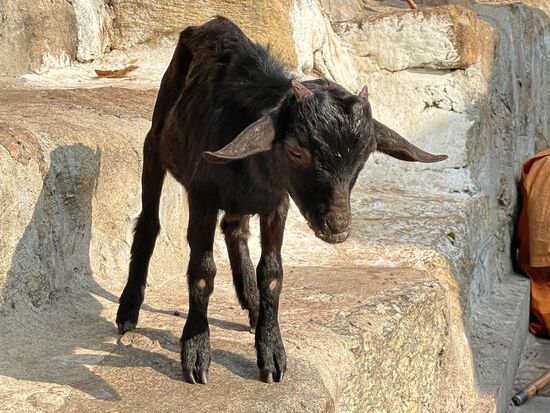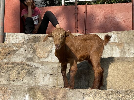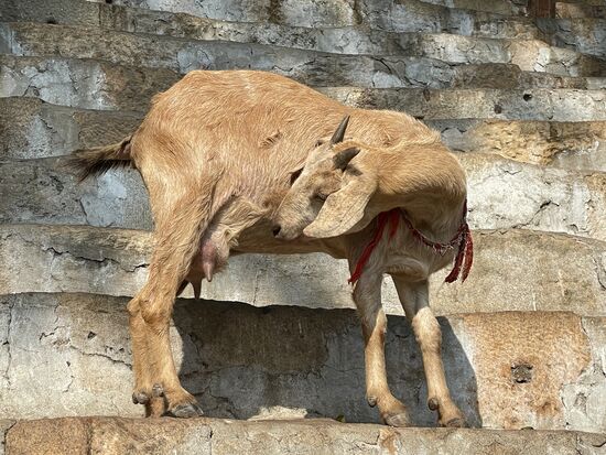 Ich setze mich auf die Stufen, die hinuter zum Wasserbecken führen und schaue mich um, sehe den jungen Geisslein zu, die sich auf den Stufen vergnügen. Ihre Hinterlassenschaft wird von fleissigen Helfern laufend zusammengewischt, so dass ich kaum je aufpassen muss, wo ich hintrete. Vielleicht gibt es einen Grund, warum gerade in diesem Tempel so viele Ziegen leben. Vielleicht hat es mit der Weiblichkeit oder mit der Göttin zu tun. Jedenfalls habe ich noch nie so viele Ziegen an einem heiligen Ort gesehen.