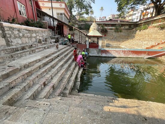 Menschen kommen zum roten Altar, legen ihre Blumen dazu, ihre Schale mit den Geschenken und gehen dann hinunter zum Wasser. Dort rollen sie die Hosen hoch, stellen sich ins Wasser, verneigen sich und waschen sich die Hände, spritzen sich Wasser ins Gesicht und manchmal hat jemand ein Gefäss dabei, mit dem er Wasser schöpft, das er dann mitnimmt.