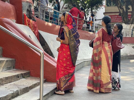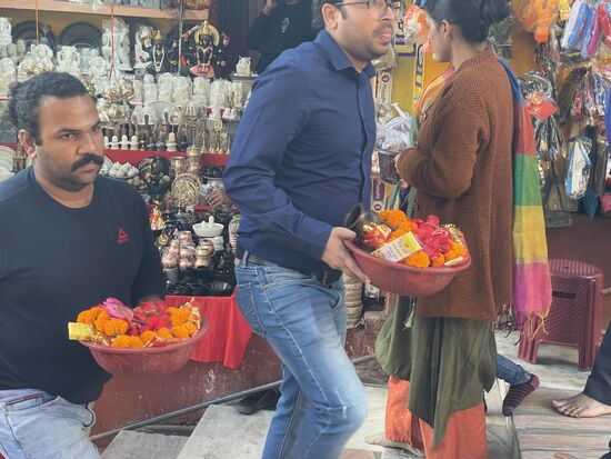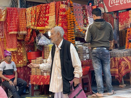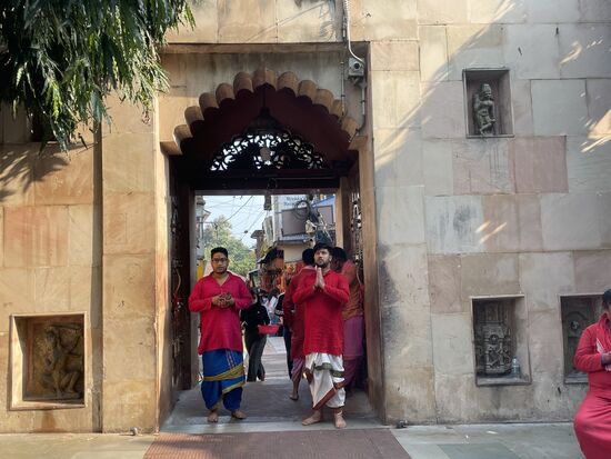 Schon auf dem Weg zum Tempel fallen mir all die Läden auf, die rote Textilien verkaufen. Rote Stoffe mit goldenen Stickereien. Auch die Pilger, die hierher kommen tragen auffällig viel rot.