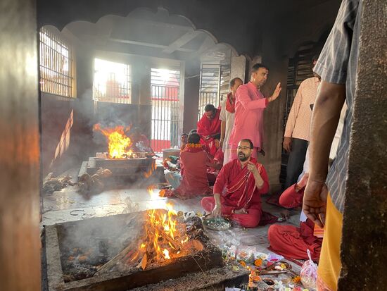 Ich mache noch einmal einen Rundgang durch den Tempelbereich, und komme zurück zum Eingang. Dort entdecke ich einen Raum mit zwei grossen Feuern, in dem Männer in roten Kleidern sitzen und das Feuer im Gang halten.
