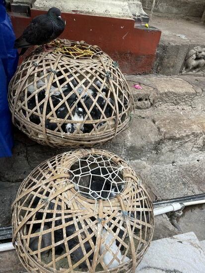 Auf dem Weg zurück zum Parkplatz begegne ich noch diesen Tauben in einem runden Bastkorb. Wofür die wohl verkauft werden. Ob sie hier auch ein Friedenssymbol sind. Oder geht es einfach darum, sie zu kaufen, um sie frei zu lassen. Damit man sich ein gutes Karma sichert. So habe ich es jedenfalls in Laos kennen gelernt. Aber das war im Buddhismus. Karma aber kennt man in beiden Religionen.