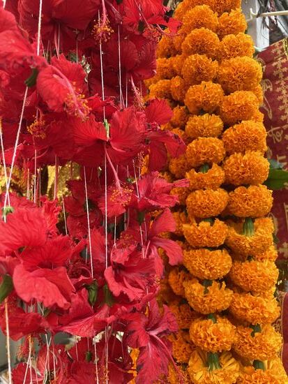Nachdem ich meine Schuhe geholt habe, und an den verschiedenen Verkaufsständen entlang schlendere, den Menschen zusehe, wie sie Opfergaben kaufen, in Körbe zusammentragen und damit Richtung Tempel gehen, überkommt mich plötzlich auch die Lust, etwas Rotes zu kaufen. Das scheint ansteckend zu sein. Allerdings kaufe ich nicht, um der Göttin zu opfern, sondern ich werde das rote Tuch mitnehmen. Obwohl ich nicht weiss, was ich mit dem roten Samt mit den vielen goldenen Pailletten überhaupt anfangen soll. Als Tischdecke scheint es mir zu aufwändig zu sein, obwohl es mit 2 x 1 Meter recht gut geeignet wäre. Ich muss einfach etwas haben, um mich an diesen Ort zu erinnern.