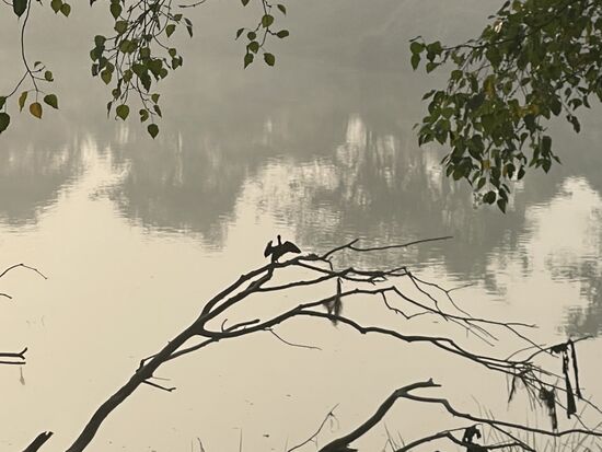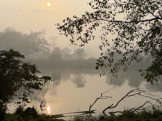 Wir sind an einem kleinen Wasserlauf und ich überbrücke die Wartezeit mit fotografieren. Die Stimmung über dem Wasser, in dem sich die Sonne spiegelt, die inzwischen schon ziemlich hoch steht, ist ziemlich verträumt, denn noch immer liegt Dunst über der Landschaft.