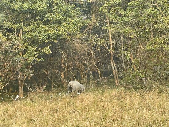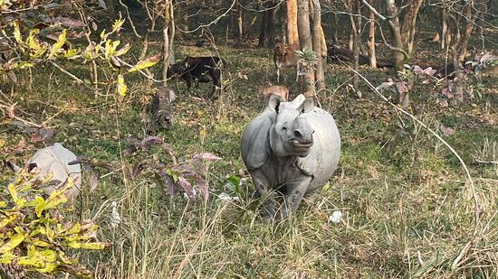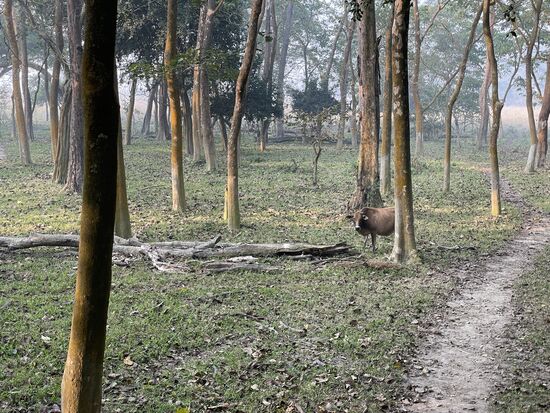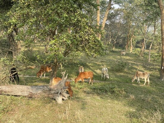 Eine solche Elefantensafari ist so aufregend, ich habe die Nashörner längst vergessen. Erwarte eh nicht, dass wir wilden Nashörner begegnen werden. Mir genügen die paar Rehe, die jetzt zwischen den Bäumen auftauchen. Und die Kühe, die im Wald ebenfalls etwas zu fressen suchen.