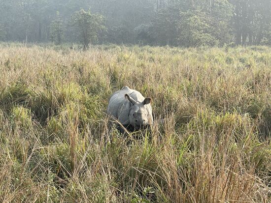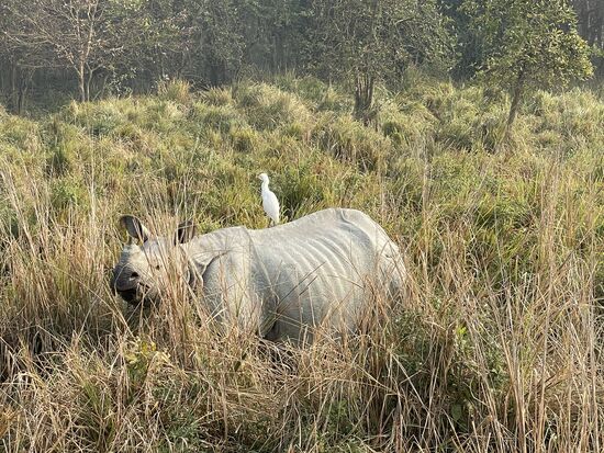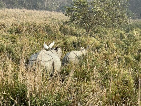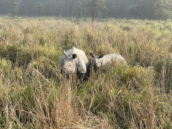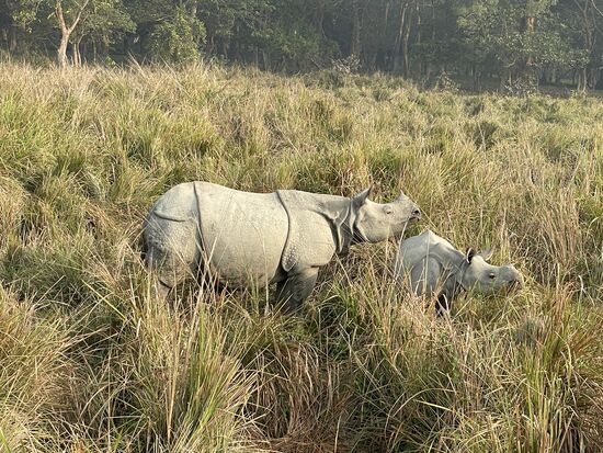 Doch dann kommen wir aus dem Wald heraus in die Steppe mit dem hohen gelben Gras und da bewegt sich tatsächlich etwas am Waldrand. Es ist ein Nashorn. Und es ist nicht allein. Ein Junges ist bei ihm. Sie sind eben dabei, aufzustehen, haben vorhin noch im Gras gelegen. Bisher waren wir auf einem schmalen Pfad, doch jetzt weichen wir ab, gehen durch das Gras und kommen den beiden Tieren sehr nahe. Diese kümmern sich nicht um uns und um die anderen Elefanten, die hinter uns ebenfalls eingetroffen sind.