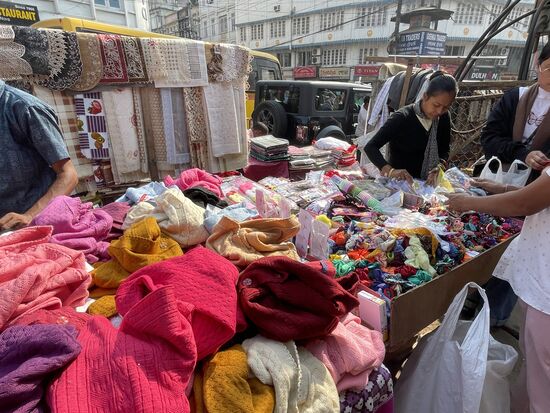 Schade, dass die Verkäufer in den Seidenläden von Assam nicht mehr die gleiche Mentalität haben wie in Varanasi. Dort konnte man gar nicht mehr aufhören, vor mir Seidentücher, Schals und Saris auszubreiten, so dass am Schluss immer Berge von Stoffen liegen blieben. Hier muss ich zeigen, was für Farben ich gern hätte und erst dann bemüht man sich, mir den ganzen Stoff auszubreiten.