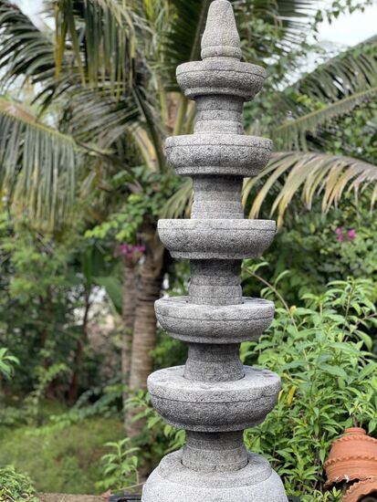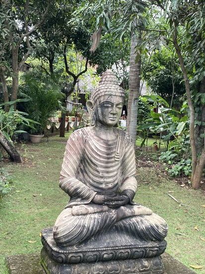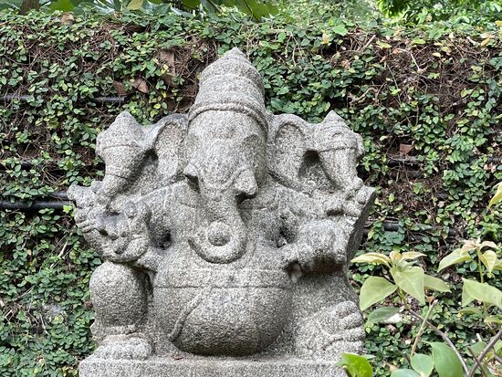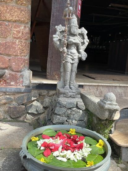 Zur Ruhe auf dem Gelände gehörten auch die vielen steinernen Statuen der Gottheiten. Unaufdringlich stehen sie zwischen Blumenrabatten, an Mauern, beim Eingang zum Speisesaal oder zur Yogahalle. Und überall gab es die kleinen Wasserbecken, die regelmässig mit frischen Blumen dekoriert wurden.